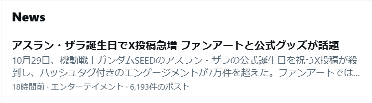 Xで「#アザラシ幼稚園」を検索したら、検索結果のニュースに「アスラン・ザラ誕生日でX投稿急増」という記事が出てきた。日本語の検索って難しいわよね