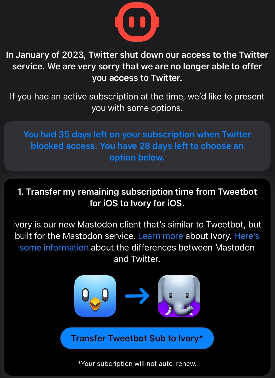 Tweetbotへのサブスクリプションの残り日数をIvoryで使うオプションを選択したので、しばらくはIvoryから投稿できるようになった。ありがたい(おはようございます)
