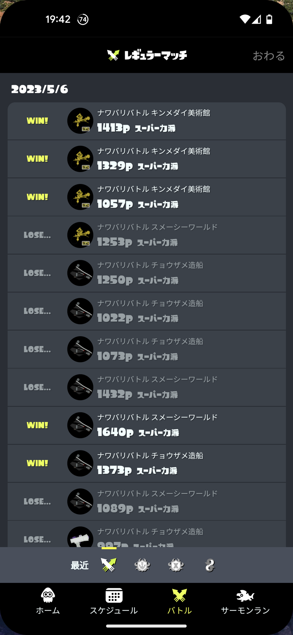 スプラトゥーンのフェスはカリスマレベルになるまでプレイし、8勝16敗とボコボコにされて終了。ひと月やってなかったから、すっかり腕がなまってしまった(ということにしておく) #スプラトゥーン3