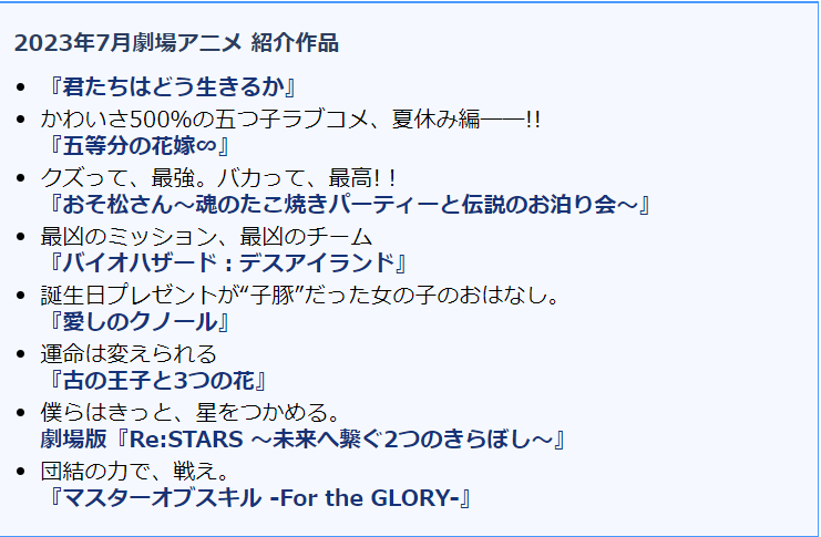 このサイトの7月公開映画一覧、行間が狭いために「君たちはどう生きるか」の内容が『かわいさ500%の五つ子ラブコメ、夏休み編――!!』に見えてビックリした。