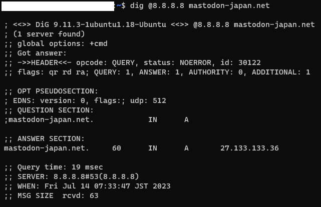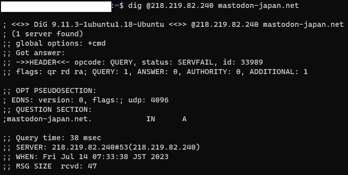 JCOMとGoogleのDNSにmastodon-japan.netの名前解決を問い合わせた結果。がんばれJCOM