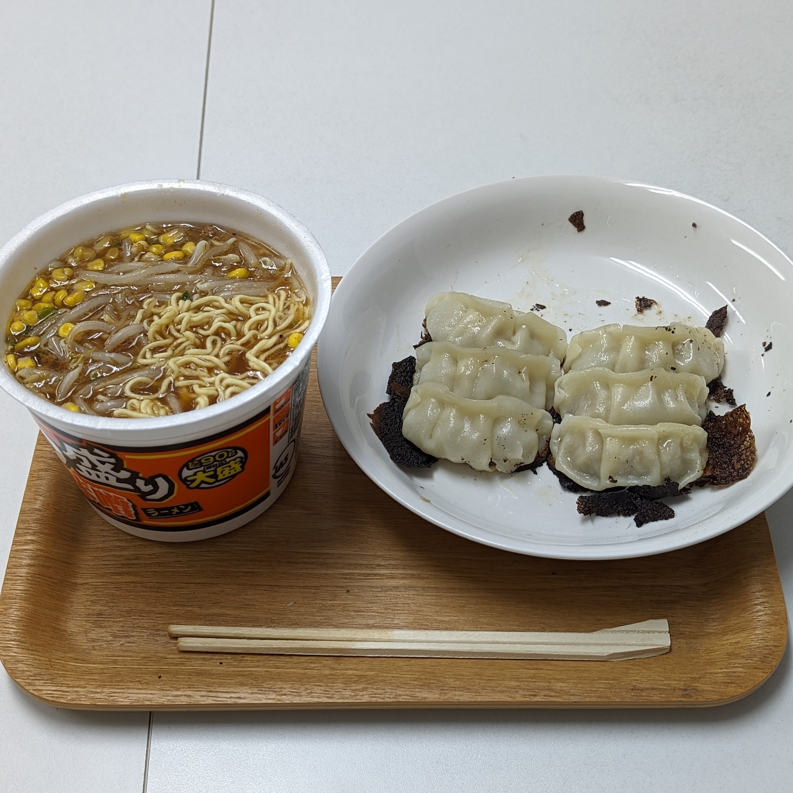 茹でたもやしを入れたごつ盛りコーン味噌ラーメンと、加熱しすぎて焦げてしまった羽つき餃子をPixel 8 Proのポートレートモードで撮影。スマホのカメラは焦げた餃子を美しく撮影するために進化した